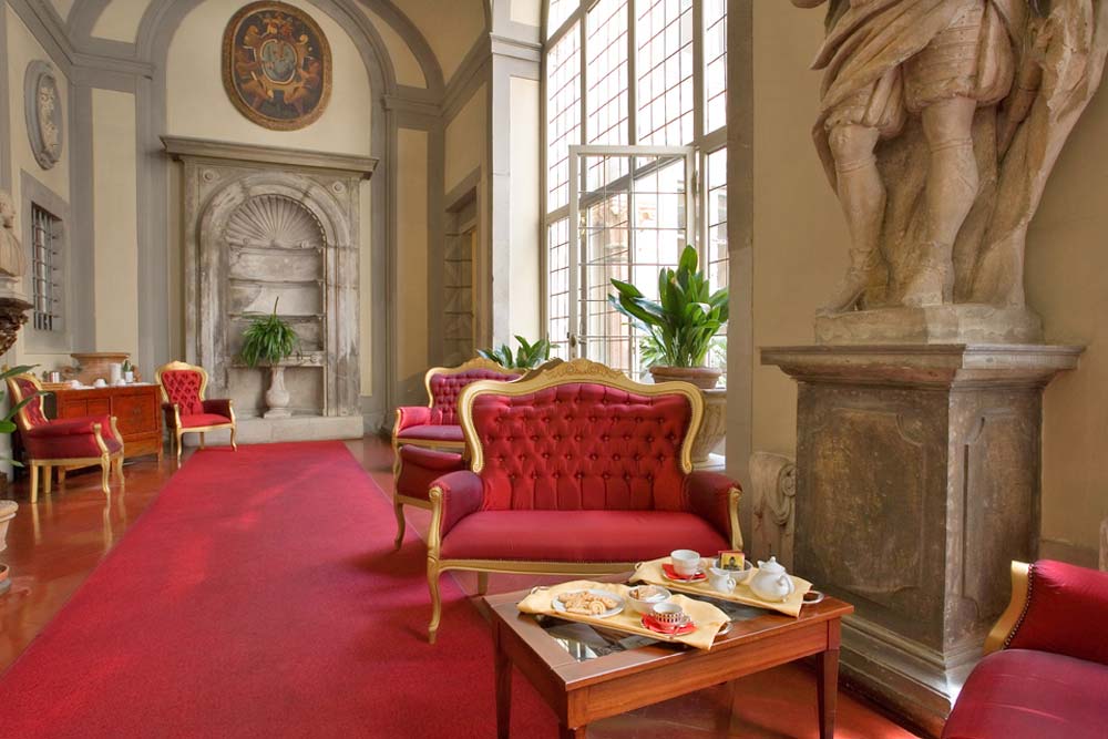 La classe di questo elegante palazzo rinascimentale, che si nota non appena superato l’ingresso, trova la massima espressione nelle sontuose suite e nei lussuosi ambienti comuni arredati con candelabri, statue, quadri e affreschi del ‘500. Lo spazioso salone Murano (oltre 160 metri quadri) in cui viene servita la prima colazione è illuminato da un lampadario originale di cristallo di Murano e sovrastato da uno splendido soffitto a cassettoni proveniente da Palazzo Farnese a Roma.